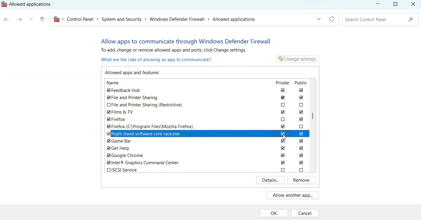 Step 2: Find the Flight Stand software in the list of programs and allow access for both Public and Private networks.
